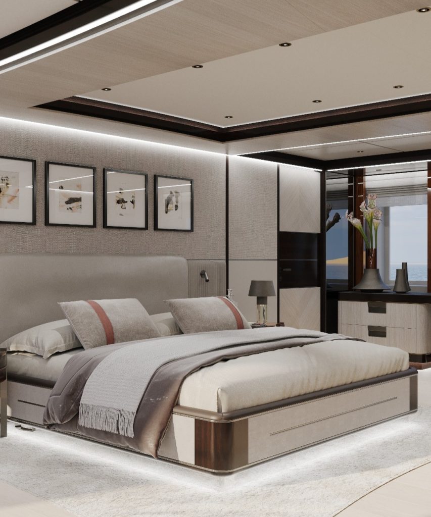 3) Tactility that travels well Stones, open‑pore woods, woven textiles: the palette reads residential, but with marine discipline—weight, expansion, salt, maintenance cycles. The goal is tactile longevity: surfaces that age gracefully and invite touch, rather than glossy panels that feel anonymous after a season.